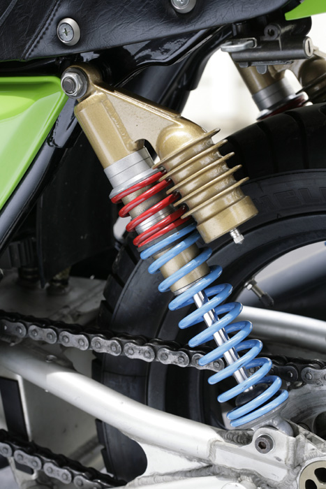 削り出しキャリパーはカワサキワークスタイプと呼ばれるもので、KRなどこの年代のレーサーに多用されている。 | 後年販売された一体式と違い、削りだしボディに鋳物のリザーブタンクを溶接したワークスパフォーマンス製リアショックは、S1が標準装備したパーツだ。 |