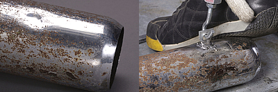 もしかしてマフラーの凹みも直せるのか?と、僅かな期待を胸にトライしたが見事撃沈。やっぱりタンク以上に板厚が厚いんですね。マフラー修理は「水圧」に限るようですね。