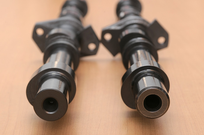 | 4バルブを動かすカム、ロッカーアームまわりの動弁系のレバー比も良くなかった。そして、それらは後継の油冷機で解決されていく。つまりカタナエンジンは、2バルブのGSから本格的な4バルブのGSX-Rとの技術的な過渡期にあったのだ。材料や技術もまだ、そのパワーに見合うだけのものがなかったということ。でも、現代技術をもってすれば、かなりの部分を解決できる。決してダメなエンジンではないのだ。 「カタナのスーパーバイクで最初に出たのがカム山のカジり。どうしようもなかった。その次がピストン。最初('82年開幕デイトナ時点)は鋳造。鋳造の限界だよ。パワーは出たもの。AMAは1025cc規定だったけど、それで152psだったかな」 あの頃('82年)を振り返る吉村不二雄さん(ヨシムラジャパン社長)。ちなみにコンプリート車1135Rの公式パワーは、150psだった。 「それで、ドイツのマーレ(MAHLE。試作部門)に頼んで鍛造品を作ってもらった。そこは少数しか生産しない。最初にちゃんと仕上がる前の半完成品が届いて、それでエンジンを回してくれっていう。そして1度火を入れたピストンを送り返して、当たりとかを見て、最終的なオーバル比を決めて仕上げた」(不二雄) このドイツ製ピストンは、熱膨張率が小さく、熱強度も高かった。 「砥石で削るのにも驚いたけど、機械も古くて。昔からこの仕事をしているらしく、オヤジ、息子、孫の3代でやってた。いろんなピストンが取ってあって、第二次世界大戦中のメッサーシュミット(戦闘機)用らしいのもあった。後でその試作ピストンの材質を分析したら、やっぱりシリコンの量や、分布のしかたが違うのが分かった。強度が違うわけだ。シリコンが入ると機械加工がしにくくなる(硬いので)。その頃アメリカ製は加工しやすい材料を使っていて、マーレは第二次大戦中から鍛造を使っていて、強度がある材料が分かっていたんだろうね。さすがだよ」 ヨシムラカタナSBは、鍛造ピストンを入れてから、ここらのトラブルから解放されたものの、最高2位(第4戦ロードアメリカと第9戦シア卜ル。ライダーはウエス・クーリー)で、未勝利に終わった。けれどど、カタナエンジンを搭載したF1レーサー(フルフローターサス)でクーリーがエルクハートレイクで優勝した。1000cc水冷V4のホンダFWS1000を相手にしてだったから、カタナエンジンのパワーは、たしかに引けを取らなかった証拠だ。 「鍛造化と同時に、ピストン裏をオイルで冷やすジェットも付けた。マーレ側の提案で。これは市販車にはなかったもので、油冷機ではSTDにも付いたけどね」(不二雄) いわゆるピストンクーラーだ。 「カタナのロッカーアームは、レバー比が高過ぎるんだよ。低いカム山で、バルブリフト量を稼ぎながらヘッドをコンパクトにしようという狙いなんだけど、面圧が高くなってカジる。当時はまだ分からなかったんだろうね。でも、テストでカジりが出たのか、出てきたロッカーアームのスリッパー面には溝が切ってあった。潤滑用でしょう」(不二雄) そしてカムは、'01年市販された1135Rの時点で見直され、Z用に続いて中空カムも市販された。 「ファイナルエディションの頃だったか、カムスプロケットを取り付けるフランジの位置を現行モデル(アニバーサリーやファイナルエディションなど)に合わせて変更したんです。カタナが出た当時、仕向け地によってカムの使用が違っていたんです。ですが、どの仕向け地用をベースに作ったかは不明で、そのままだった。でも、アニバーサリーでやってみるとバルブタイミングが違う。それで変更して現在もそのフランジ位置で製作しています」 そう語るのは1135Rの開発に携わった川口裕介さん(技術開発部商品開発課係長)。最新作中空カムはST-1とST-2があるが、1135RのときもST-1だった。 「1135Rの時も、ST-2よりも総合的にST-1の方が良かったからです。パワーフィーリングで選びました」 (川口) 「ST-1カムは、STDのバルブスプリングで十分。ST-1にレートの高いバルブスプリングを合わせると、面圧が高くなってカジりやすくなる。意味がないよ」 (不二雄) ただ、現在でもST-2は強化スプリングを使う。新作の中空カムは、軽量だから抵抗が小さく、それだけでもパワーロスが迎えられる。さらに「見た目にツルっとしているのは、バレル処理をしてある。バレル処理は完成後に行う研磨で、余分な角などが取れる。研磨と言ってもカム山のプロファイルが変わるほどではない。アメリカではモトクロッサーやATVのミッションにも使ってる。ギヤの入りが良くなるし、耐久性も出るみたいだよ」 (不二雄) |  ヨシムラ内でスタッフが'01年に撮影した、5台の1135R完成車。ネーミングは、φ74mmピストンを使って1135.4ccとなることに由来する。ベースはファイナルエディションで、車体もエンジンもヨシムラがすべて手を入れた。150ps、車両重量197.8kg(ヨシムラ実測)。価格は358万円~ 図面も型紙もデータも1135Rが ハンドメイドされた証拠だ  製作したパーツ類の型紙。NK-1当