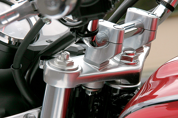 フレームは典型的な構成のダブルクレードタイプで、φ38mm径のダウンチューブが、エンジンを取り囲むループを描く。ダウンチューブのヘッドパイプへの突き合わせ部は、あえてプレートを介する構造とし、捻りの自由度を持たせている。また、エンジンとフレームのクリアランスを極力詰めて、コンパクト化を図っている。ホイールベースはCB1300SFよりも25mm短い1490mmで、キャスター角は2度寝た27度。シート高は15mm低い765mmで、サイドカバー幅が40mm狭くされ、良好な足着き性を得ている