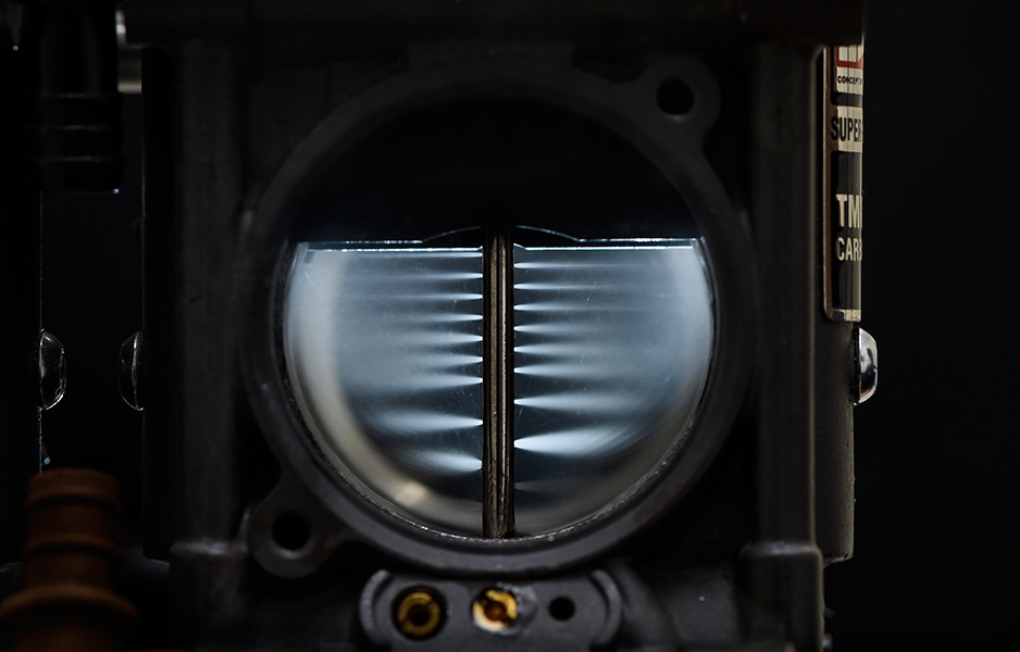 MJN's atomizing performance (micro-misting of fuel) is beyond expectations. As the throttle opens, atomization becomes more intense, producing a white cloud of fuel across the carburetor throat. The beauty of Yoshimura MJN carb is that it takes advantage of the strong vacuum pressure developed at the center of the throat, and its superiority over the conventional carb with a single main jet is obvious. It's a perfect example of a great concept and design.