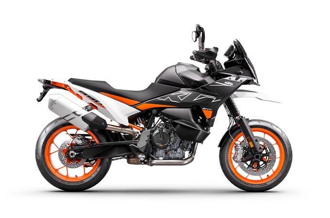 890SMTは、従来のスーパーモトにオンロード重視のパフォーマンスとツーリングバイクの要素を付け加えたスーパーモトツアラーです。KTM890シリーズのプラットフォームをベースに、このカテゴリーでトップレベルのパワーウエイトレシオを目指して開発。外観にはアドベンチャー系のマスク、足回りには17インチのオンロードタイヤを採用。KTMのラインナップのなかでは、アドベンチャーとストリートの中間的な位置付けのモデルとなります。