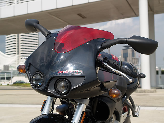 ビューエルは全モデルが上記の特徴を持ち、ハンドルポジションや排気量などでそれぞれの個性を出している。シティユースやツーリングに適したモデル、ON/OFFを問わず走破できるモデルなどラインナップは6種類ある。今回試乗したFirebolt XB12Rはビューエルのラインナップの中でももっともスポーツ寄りなモデル。他モデルに比べ、ステップのポジションは若干高く、ハンドル位置が低い位置に固定されたクリップオンハンドルのため、ライダーの姿勢は体を丸めて乗車するポジションになる。前傾姿勢は若干きついものの、幅広でニーグリップしやすいタンク(フューエルタンクではなく、実際はエアクリーナーの役割を果たす)形状のおかげで下半身で挟み込めばポジションはキツくない。前傾ポジションでライディングするため、一見すると小さく見えるウインドスクリーンも効果は充分。胸元の高さ程度までなら走行風から守ってくれる。