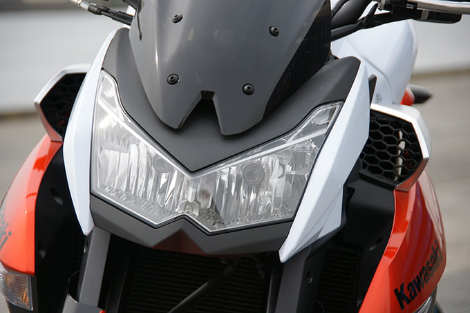 攻撃的なビジュアルのフロントマスク。ロービームでは向って左側のみが点灯し、ハイビームでは両側点灯となる。タンク横のグリルはクールエアシステムの吸気口だ。
