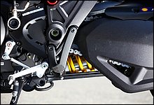 ディアベルに搭載されるエンジンはムルティストラーダ1200と同じ水冷Lツイン「テスタストレッタ11°」だ。これは吸気バルブと排気バルブが同時に開いている間隔(角度)を示すもので、数値が小さいほど燃焼効率がよくなり、燃費向上や排気ガスをクリーンにする効果がある。ちなみにスーパーバイク1198の場合は高出力特性を得るために41°に設定されている。これまではハイパワースポーツモデル向けとされていた水冷Lツインだが、ムルティストラーダ1200からは「低回転時も安定した出力特性」を特徴としたセッティングが施されているというわけだ。
