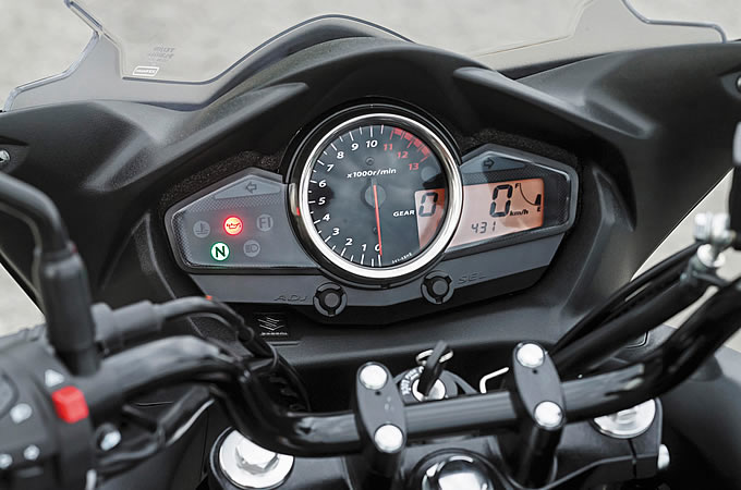 センターにアナログのエンジン回転計を置き、右に多機能の液晶デジタルパネルを配置。表示されるのは速度、ツイントリップ、燃料残量、時計のほか、回転計にかかる部分ではギヤポジションを表示。任意にエンジン回転数を設定でき、そこに達すると告知を行うエンジン回転インジケーターやメンテナンスインジケーター等も備える