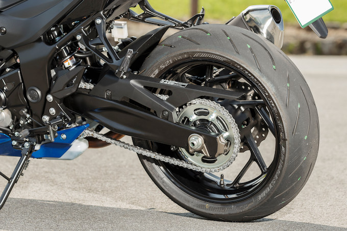 異形断面のスチール製スイングアーム、10本スポークのキャストホイール、ペータル式ブレーキディスクはGSX-S750用の新作だ。フロントキャリパーは片押し式2Pからラジアルマウント式4Pに変更される。タイヤは市販車ではまだ採用例が少ないブリヂストンS21を履く。