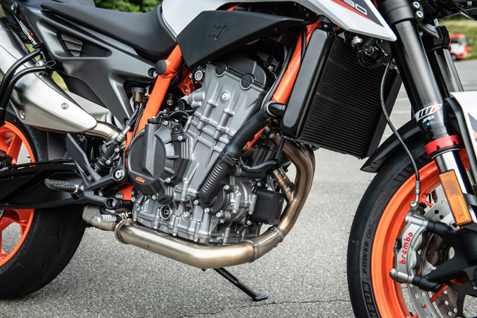 790DUKE用をベースにボア×ストロークともに拡大された水冷並列2気筒DOHC4バルブ890ccから最高出力89 KW (121 PS) / 9,250rpmを発揮。吸排気バルブ径の拡大やカムリフト量アップの他、新型コンロッドと鍛造ピストン、新型クランクとバランサーを採用するなど全面的に見直されている。