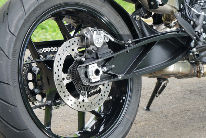 トラスデザインで軽さと高剛性を両立するダイキャストスイングアーム。リアサスペンションはリンクを持さない直付け式。スリッパ―クラッチとMSR(オプション)により、急な加減速やシフトダウンでも、リアタイヤに安定した動きを得られる。