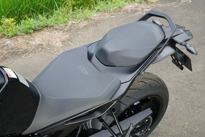 820mmのシート高は、低いとは言えない数値だが、そもそも車重が軽いことや、車体前方に向かって大胆にシェイプされている形状であり、足つき性は悪くない。パッセンジャーシートも形状が良く大型グラブバーも備わっているのでタンデムライドも楽しめる。