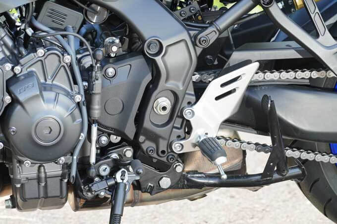 MT-09、XSR900系と同じく、むき出しになった内臓のようなデザインのサイレンサーを採用。スタイリング的なポイントとなっていることはもとより、車体下部で纏めることでマスの集中化に貢献している。