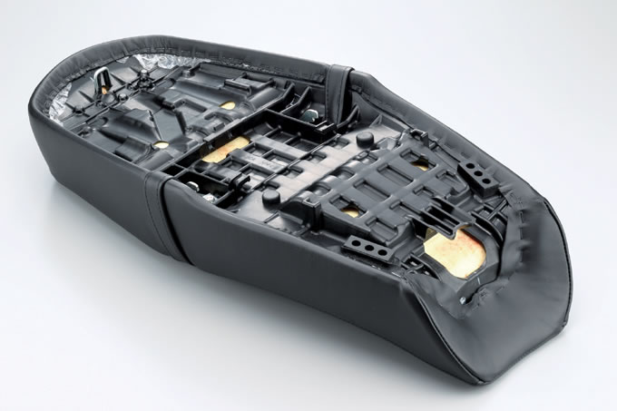 …そんなCB1100用のカスタマイズパーツに、Kスタイルという名のシートが加わった。これは2010年春の東京&大阪モーターサイクルショーに参考出品されていたカスタムシートの改良版で、ネーミングはCB750フォアの形式名に由来する。厚みのある形状や表皮の模様など、CB750フォアの特徴をよく捉えており、懐かしさを覚える人も多いはずだ。