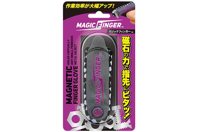 KURE“フォーミング ウルトラクリーナー”は水溶性なので金属のほかプラスチック、合成皮革など様々な素材に使える。420㎖入り。“マジックフィンガー”は指先の磁力でボルトやナットを付けて作業性を上げるアイデアツールだ。どちらもオープン価格。