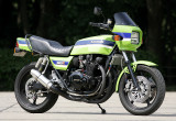 世界最速の称号を英国車が死守していた60年代後半、カワサキがその称号を奪取するために出した回答がこのマッハIIIだった。2スト並列3気筒という実に個性的なエンジンを持つこのモデルは、1968年のモーターショーで発表された。トップスピードは時速200km、ゼロヨン加速で12.4秒を誇ったマッハIIIは、同年に発表されたCB750とともにメイドインジャパンのモーターサイクルのイメージを変えた、歴史的な1台である。北米市場向けに輸出された、この初代モデルは白タンクにブルーライン、ニーグリップ部分にエッジの効いたプレスラインを持つ、俗称「エグリタンク」を搭載するのが特徴だ。