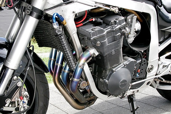 エンジンはアメリカ・JE製φ81mmピストンへの置換で、1127→1216ccに排気量をアップ。ヨシムラ製ST-2カム、ポート研磨、燃焼室形状変更など、ヘッドチューニングも実施される。現在の吸排気はFCRφ41mm+USヨシムラ・チタンサイクロンの組み合わせだ