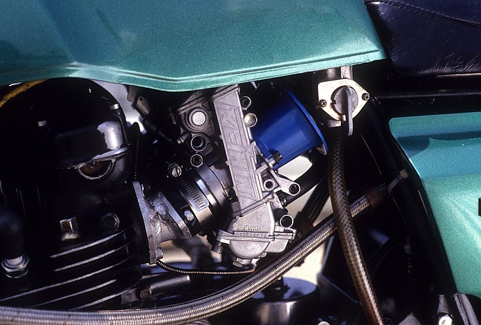 ヘッドは大幅改造により吸気側をストレート化し、ツインプラグ化も図っている。このストレート吸気に合わせてFCRキャブはダウンドラフトタイプを使用した上でフロート形状を改造