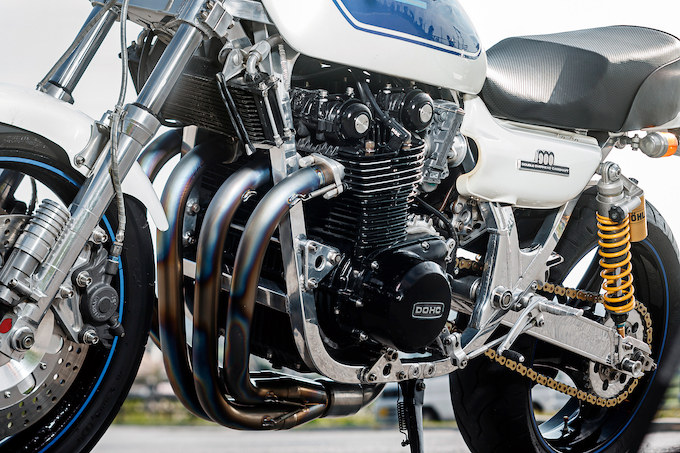 エンジンはヨシムラφ69mmピストンでの903→987cc仕様でヨシムラストリートカム、クロスミッションも組まれる。キャブレターは往時のCRφ33mmからFCRφ35mmに換わるが、ファンネルはネットが外ではなく、内向きに入っている。シリンダーヘッドにはプラグ折損防止かつ高質感を狙うカムサイドカバー(市販中)を追加