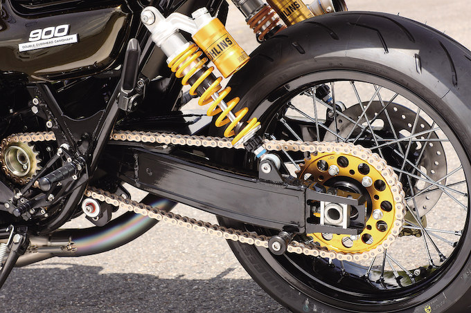 ドゥカティ純正を流用したホイールは1.85-19/2.15-18→3.50-17/5.50-17と17インチZにも使いやすいサイズ。リヤアームはXJR1300改だが、こうしたパーツはオーナーがZ1-R改(KZ900ベース)で使っていたものを再利用したという。ステップはナイトロレーシング