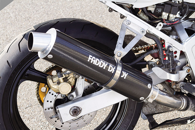 2.75-17/3.50-17のホイールはSTD。リアショックはR6用がベースだが、フロントとともにセッティングを見直している。マフラーはファディーダディー