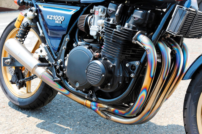 エンジンはワイセコ製φ73mmピストンを組んだ1,105cc仕様で1015ccからアップ。ヨシムラST-1カム、INφ38mm/EXφ32.5mmバルブ、ポート拡大&研磨加工なども行われており、吸排気系はCRφ31mmキャブレター+エクステンション製チタン手曲げエキゾースト(ショートメガホンサイレンサー仕様でこちらも素材はチタン)。スイングアームも同店製角鉄。