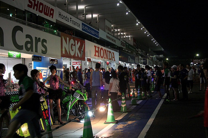 20各車ヘッドライトを点灯。光の尾をたなびかせながらサーキットを駆け抜けます。暴力的なエキゾーストノートと、幻想的なライトオンの走り。対照的なふたつの要素が絡まり合い、印象的な風景を描き出しています。これも8耐の魅力のひとつです。