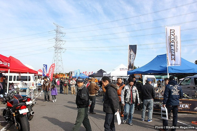 さまざまな催し物があるなかで特に来場者の注目を集めたのは、午前中に行われたドラッグレースです。日本国内でロードライダーほどこのレースカテゴリを手厚く取り上げているバイク雑誌は、まず無いと言っても良いでしょう。本来であれば全長1km ほどの直線が必要なところですが(減速する距離も必要のため)、コース1000のホームストレッチではそのショートヴァージョンとして 『1/16マイル(約100m)戦』 が行われました。スタートしてあっという間に減速となりますが、スタート前のバーンナウトやすぐ目の前を駆け抜けるモンスターマシンの姿に、コース脇ではたくさんのギャラリーが見入っていました。その一方で、バックストレッチでは鈴木大五郎さんによる 『BKライディングスクール』 が行われ、ビギナー向けに 250cc の練習用バイクを使って “ヒザ擦り” をレクチャー。寒い季節にもかかわらず、生徒たちはいい汗を流していました。午後になればエクストリームショーやカスタムショップのスペシャルマシンがデモラン。さらに、パドックエリアには40以上もの出展ブースが並び、バイク専用駐車場では 『カスタムバイク・コンテンスト』、その奥では自慢のカスタムマシンと誌面に登場できる 『The グッドルッキン Bike 撮影会』 など、観ても楽しい、参加しても楽しい読者イベントとなりました。