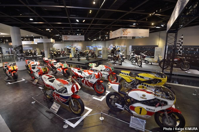 1812年ぶりに全面リニューアルされたコミニュケーションプラザ2階の「歴史展示フロア」。歴代の市販車が年代別に分けられるなど、より見やすくなり、バイク以外のヤマハ発動機製品も展示。写真手前は、レーシングマシンが集められた「レースの歴史ゾーン」。