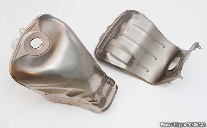 06SPモデルの燃料タンクはチタン製で、標準モデルのスチール製よりも1,300g軽い。スチール製と金型を共用しながらも、深絞り成形を実現、従来なら3ピース構造となるところ、2ピース構造を可能とし、溶接部を削減させている。