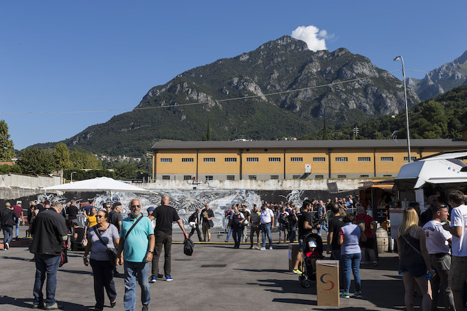 「モト・グッツィヴィレッジ」と名づけられた広場には、フルモデルラインナップとカスタム車の展示、イタリアンフードとカフェのフードコート、休憩できるテラス席やDJブースが設けられた。この広場は使われなくなった古い工場棟を解体して生まれたものだ。