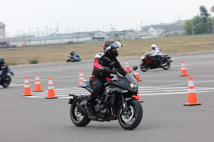 スクールメニューは走る、曲がる、止まるに必要な内容。ブレーキングや加減速時のライディング姿勢など、一回走るたびに先生がアドバイスをくれるのでコツがつかみやすい。