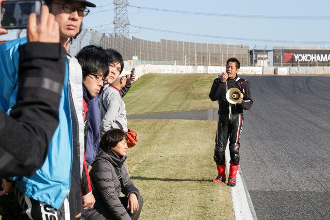 筑波サーキットは第1コーナー、第1ヘアピン、第2ヘアピンと、180度以上ターンするコーナーが3つある。また第1コーナー、第2ヘアピン、最終コーナーは複合コーナーになっていて、コーナーへの進入がより難しいテクニカルなレイアウトだ。路面は荒れが少なく、グリップもいいため、思い切って走れるという特徴もある。こういった内容はインストラクターがコースを走行し、それを見ながら生見氏により説明される。これ以外にも初心者にありがちなミス、注意点や、ブレーキングのポイント、ライン取り、加速のポイントなどがレクチャーされた。