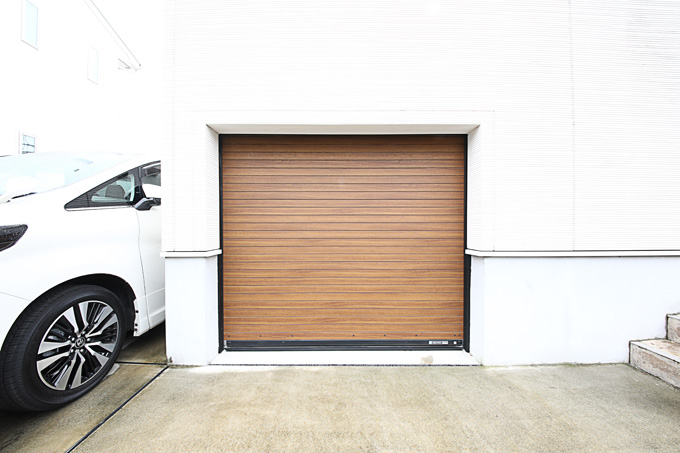 ウッド調パネルのガレージドアには、『文化シヤッター』のポルティエを採用。幅2.42m、高さ1.8mとコンパクトサイズ。