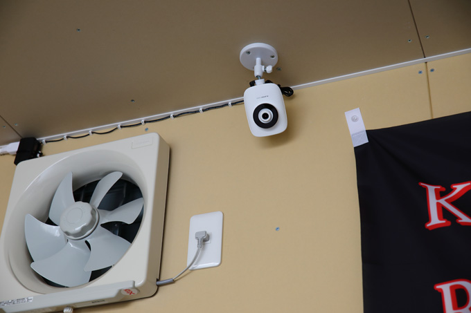 セキュリティ用のネットカメラをインターネットで購入し、DIYで設置している。ネット環境があればスマートフォンなどでガレージ内の映像をライブ確認することができる。