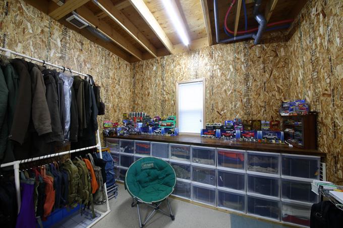 ガレージのクルマの後方にはDIYでストレージを設置し、服などを収納している。その分2階の居住スペースは広々と使えている。