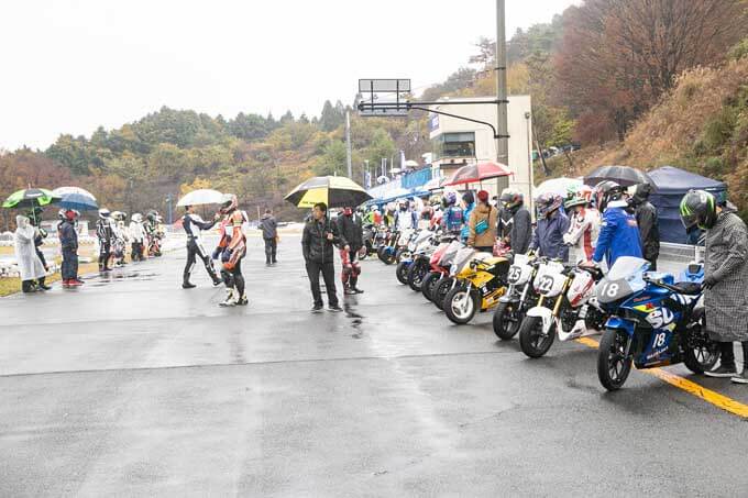 120分耐久レース、スタート前の様子。スタッフがライダーに傘を差し出すなど、雨のなかのスタートとなりました。