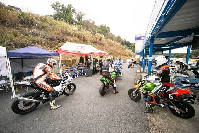 ショップ対抗の練習走行の序盤は、まだギリギリ雨が降っていない状態。各ライダーがそれぞれのペースで走行をスタートさせます。