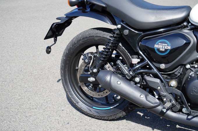 ややエンド部分に向かい上方にセットされたマフラーからはシングルエンジン特有の歯切れの良いサウンドが響き渡る。リアサスペンションはツインショックタイプで、若干柔らかめに感じたが、その分乗り心地が良い。