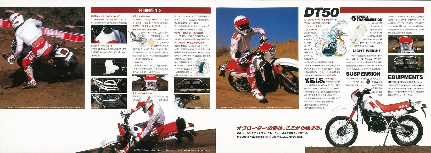 AMAスーパークロスで大活躍していたリック・ジョンソン(’86年にホンダに移籍した)に憧れて、鮮烈デビューを飾ったDT200Rを駆って週末のモトクロス走行を楽しむライダーが増えた。2型は燃焼室形状の変更により30馬力から32馬力へ。1速のギヤレシオのクロス化で、よりスムーズな加減速を実現。このカタログは3型だ。フルサイズボディの末弟、DT50もエンデューロで意外な速さを見せた