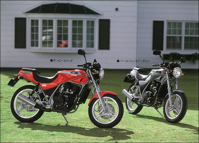 「世界最速の実力を誇るGPZ1000RX」の文言も見えるカタログ。単気筒250ccでも250CSは高性能だから高速走行で辛い思いはしないことも強調されている。直線基調とはいえ、車体を横からじっくり見ているとタンクからテールまわりのラインはGPZ1000RXを彷彿させるのも分かってくる。リヤサスはツインタイプだが、とにかくスリムだ