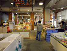 道の駅としての正面入り口は1階の一般道からで、2階部分が有料道路のパーキングエリアから出入口です。1階部分にはお土産販売コーナーが2ヵ所、それに海産物販売店と農産物販売店があります。2階部分にはレストラン1店と軽食コーナーが4店あり、道の駅のインフオメーションとパーキングエリアのインフォメーションがそれぞれあります。