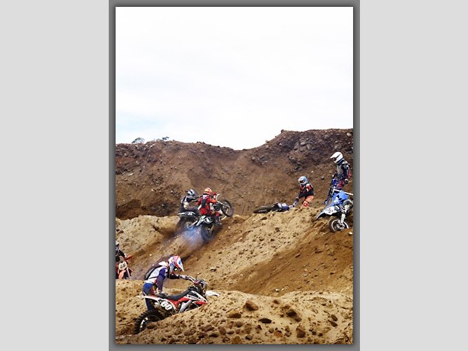 360分クラス初めの難所での1コマ。砂山が思いの外柔らかく、勢い良くアプローチしてバイクが埋まりライダーは発射。 f16 1/500秒 ISO400